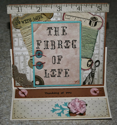 This I made in a tag style 5x7 with plenty of mat and layering on its front. I followed a pattern for this out of a magazine.