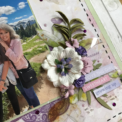 To this base card I have 2 layers one from Coastal and the other from the opposite side of the gingham and to that I added another trimmed down cut apart. I added a little bit of lace to the panel and a small cluster of flowers. I die cut the 21st using a cut apart piece I knew I wouldn't use so the colours all work. Again a few pearls to finish.